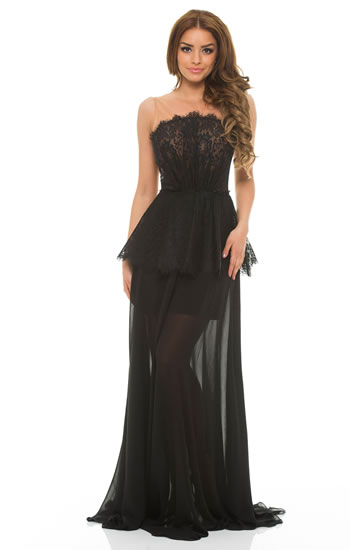 Daca esti adepta rochiilor de designer iti recomandam o rochie cu dantela eleganta, lunga neagra din voal, cu aplicatii din dantela vaporoasa. Rochia este confectionata din voal vaporos, usor transparent, cu corset si naplicatii din dantela rafinata, iar inchiderea se face cu fermoar la spate.