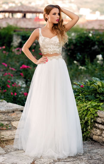 Pentru o tinuta inedita te poti orienta spre un set format din top si fusta ce inlocuieste cu succes clasica rochie. Acest set alb este format din corset din dantela brodata cu fir auriu si fusta ampla din tull, fiind potrivit pentru ocazii speciale. Este o tinuta spectaculoasa, cu un mix de materiale: tull, dantela, broderie, ce va atrage cu siguranta atentia celor din jur.