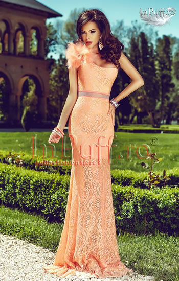 Rochia dantela lunga de seara tip sirena pe un umar este tot ce ti-ai putea dori pentru un look de diva. Este o rochie de seara lunga din dantela somon cu croi tip sirena pe un umar, cu pene pe umar detasabile si brau detasabil cu strasuri in talie.