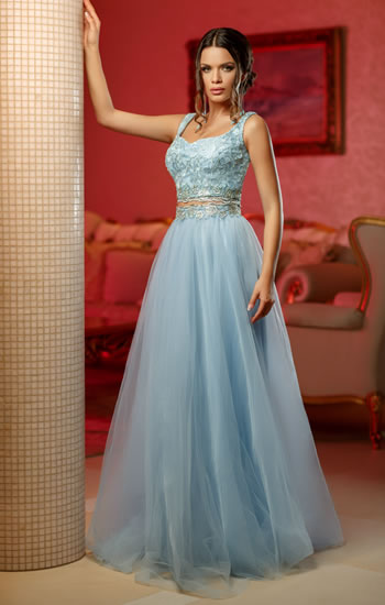 Descopera o tinuta diafana si romantica cu acesta rochie din doua piese intr-o culoare pastelata bleu. Acesta rochie de seara este formata din corset din dantela brodata cu fir auriu si fusta ampla din tull eleganta, fiind potrivita pentru ocaziile speciale din viata ta. Este o tinuta spectaculoasa, cu design unic, cu care te vei face remarcata, Mixul de materiale din tull, dantela, broderie, va face din aparitia ta, una deosebit de pretioasa.