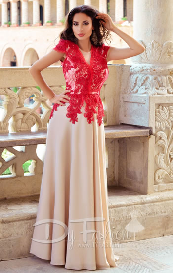 Alege la evenimente speciale aceasta superba rochie lunga eleganta de seara in nuante de rosu si bej. Este o rochie realizata din voal bej si dantela rosie ce pune in evidenta partea superioara a rochiei, avand decolteu adanc la spate si tull la bust.