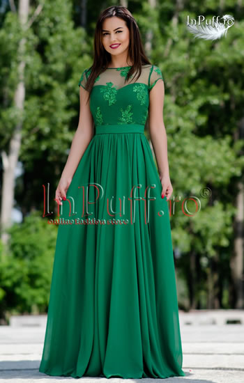 Rochia verde cu dantela lunga este o rochie eleganta de seara. Este o rochie rafinata, feminina, ideala pentru o aparitie spectaculoasa, confectionata din voal in partea de jos si dantela cu broderie in partea de sus. Spatele gol in forma de V ii da un plus de senzualitate.