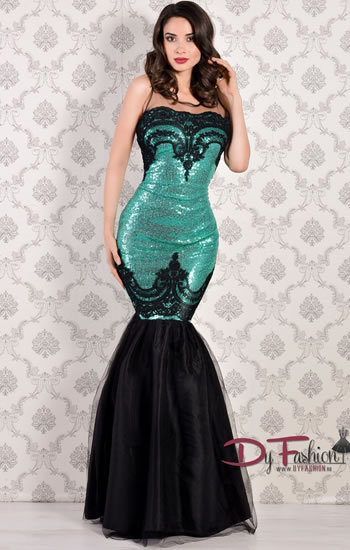 Fii in centrul atentiei cu aceasta rochie verde lunga superba stil sirena, cu aplicatii de paiete. Este o rochie lunga de seara rafinata si eleganta, in nuante de negru si verde, mulata, ce urmareste senzual formele corpului.