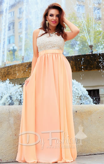 Atrage privirile tuturor la un eveniment special cu aceasta superba rochie voal xxl in nuante de bej si roz somon. Este o rochie lunga de ocazie cu decupaj la spate, cu aplicatii de paiete la bust si fundita la spate.